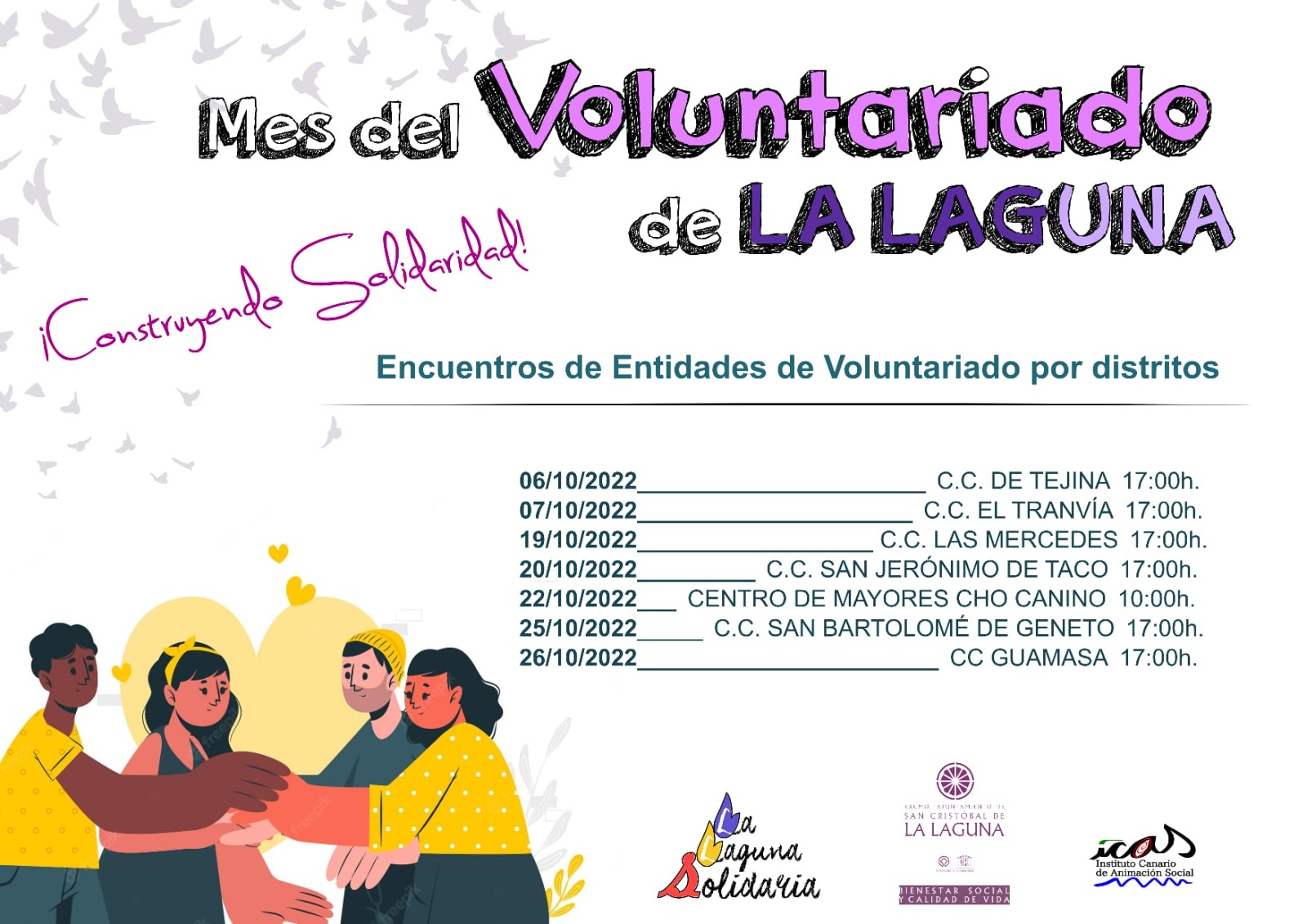En el marco del Mes del Voluntariado en La Laguna, que tiene por lema ¡Construyendo solidaridad!, estos encuentros se realizan de manera sucesiva a lo largo de octubre en los diferentes distritos de La Laguna. Se iniciaban esta semana en Tejina y La Cuesta, y continuarán en próximas fechas en los Centros Ciudadanos de Las Mercedes (el día 19 de octubre), San Jerónimo de Taco (un día después), el Centro de Mayores Cho Canino (sábado 22 de octubre), el Centro Ciudadano de San Bartolomé de Geneto (el día 25), y el Centro Ciudadano de Guamasa (el 26 de octubre). Todos los encuentros tienen lugar a las 17:00 horas salvo el de Cho Canino, que será a las 10:00 horas.