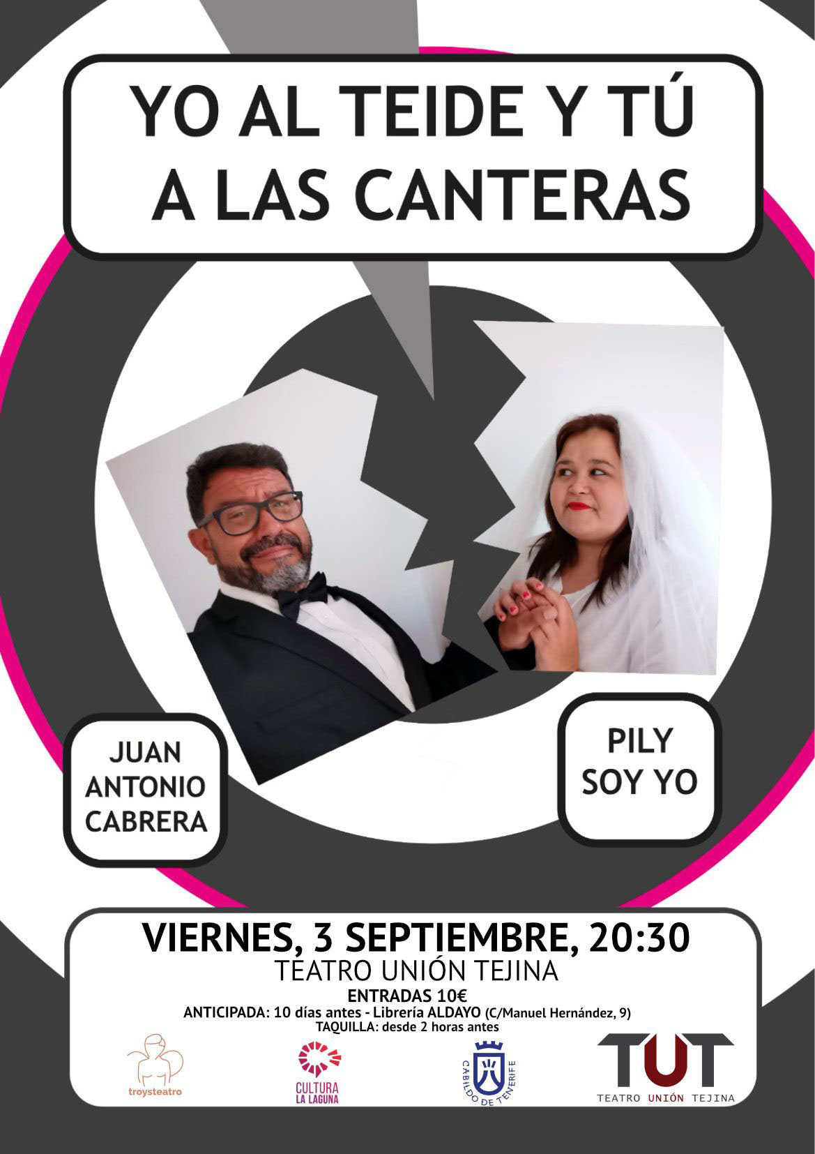 La Concejalía de Cultura del Ayuntamiento de La Laguna presentará este viernes, 3 de septiembre, la obra Yo al Teide y tú a Las Canteras, de la mano de los cómicos Juan Antonio Cabrera y Pily Soy Yo, que representarán de forma hilarante la historia de amor entre una chicharrera y un canarión. Las personas interesadas en asistir a esta cita, en el Teatro Unión Tejina, podrán adquirir sus entradas en la librería Aldayo o en taquilla dos horas antes del comienzo del espectáculo.