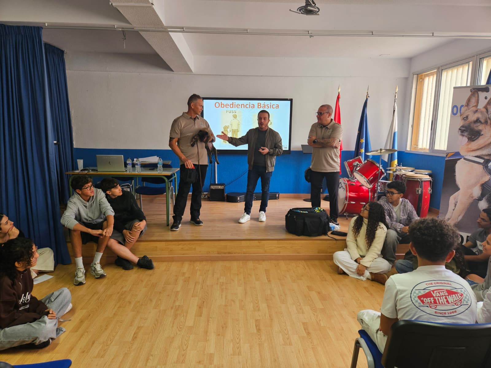 Además, estas sesiones cuentan con la participación de los perros K9 jubilados Anker y Shakira, cuya trayectoria permite acercar al alumnado la importancia del respeto y el reconocimiento al trabajo animal, así como con el apoyo de Coca y Kira, cachorros cedidos para la futura Unidad Canina de la Policía Local de La Laguna. Esta convivencia directa con animales en distintas etapas de su vida refuerza el mensaje educativo del proyecto, favoreciendo una comprensión real y empática del vínculo entre personas y perros, y poniendo en valor el cuidado, la paciencia y la responsabilidad que implica su formación y bienestar.
