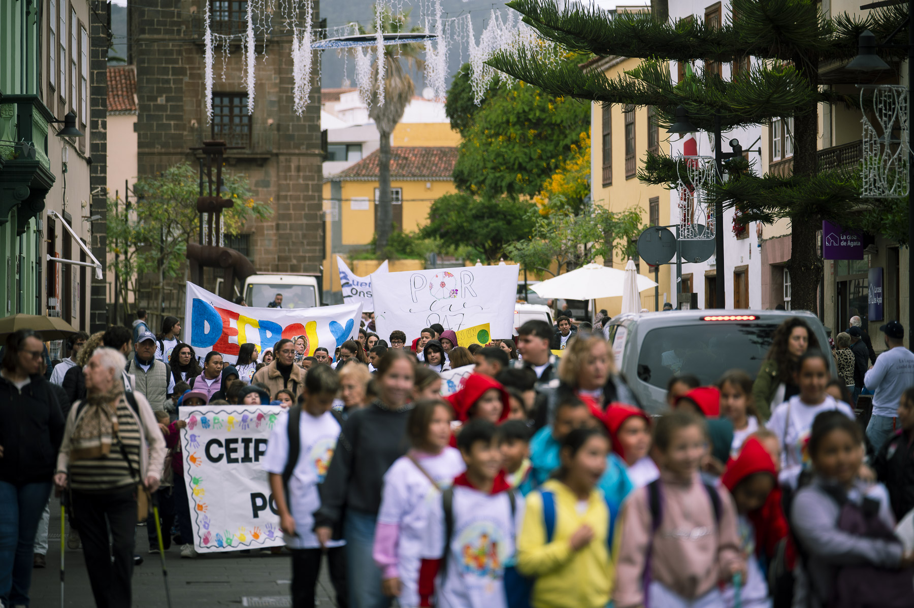 Quince centros escolares del municipio se han sumado a esta iniciativa, con una marcha que partió de la plaza de la Concepción y transcurrió por las calles Obispo Rey Redondo y Viana hasta llegar a la plaza del Cristo. Tomaron parte en el recorrido los CEIP Camino Largo, Punta del Hidalgo, Aguere, La Verdellada, Ángeles Bermejo, Clorinda Salazar, San Matías, San Luis Gonzaga, los colegios Decroly, Mayo, Mayex, Buen Consejo, La Salle y Luther King y el IES Padre Anchieta.
