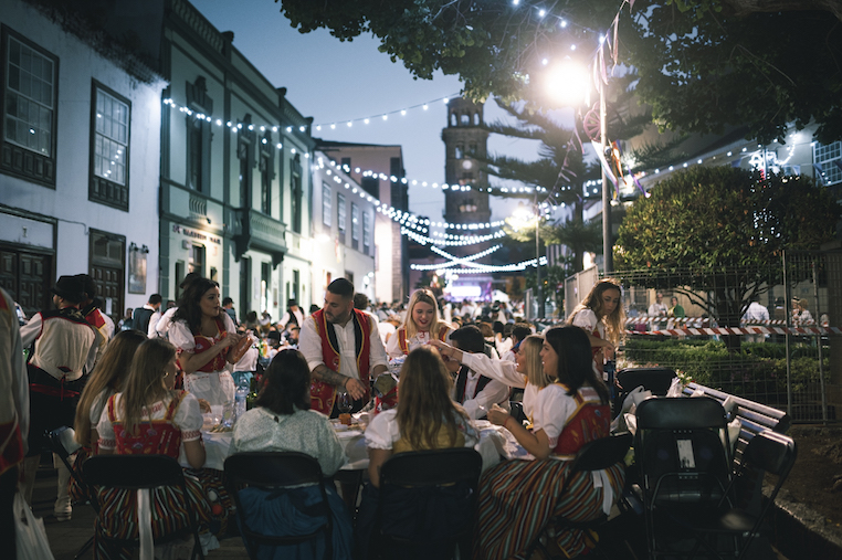 Las 450 mesas colocadas por la Concejalía de Fiestas en el entorno de la torre de La Concepción estaban abarrotadas desde la entrada de la noche por multitud de asistentes y gran variedad de platos típicos, entre los que no podían faltar las garbanzas y el gofio, mientras los grupos folclóricos amenizaban la velada.